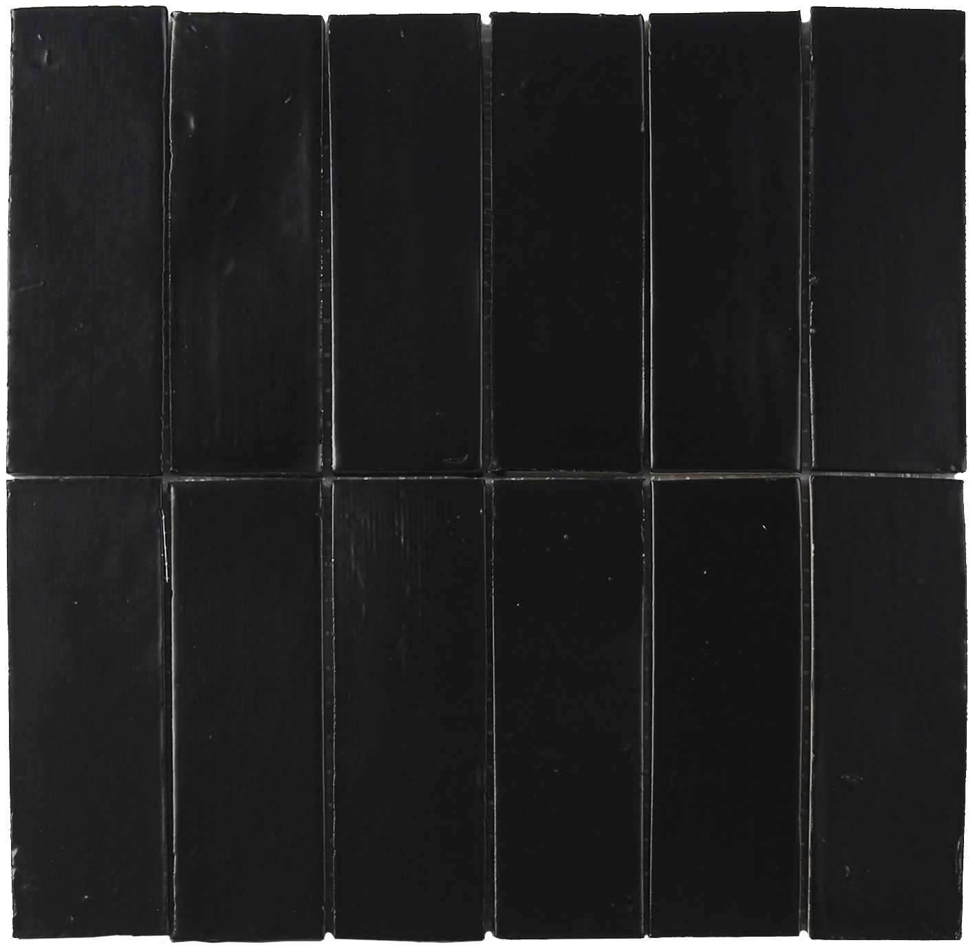 التفاصيل السريعة: بلاطة موزاييك سيراميكية مستطيلة، بتخطيط شبكة ٢×٦، بلون أسود قاتم لامع، مناسبة تمامًا لجدران التأكيد والمناطق البارزة في الحمامات وديكورات interiors الصناعية العصرية
