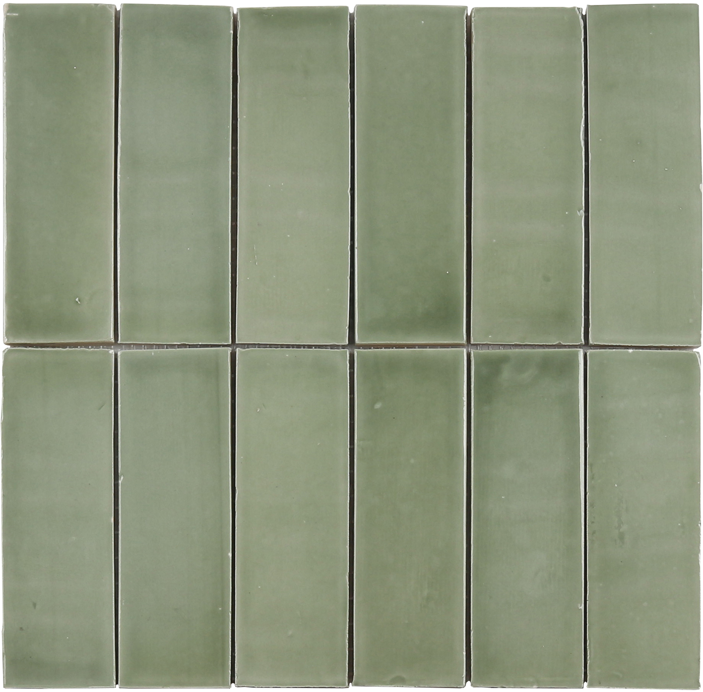 รายละเอียดโดยย่อ: กระเบื้องโมเสกเซรามิกแบบสี่เหลี่ยมผืนผ้า จัดเรียงเป็นตาข่าย 2×6 ผิวเงาสีเขียวหม่น เหมาะสำหรับติดผนังห้องน้ำ ผนังหลังเตาในครัว และการตกแต่งภายในสไตล์ธรรมชาติ